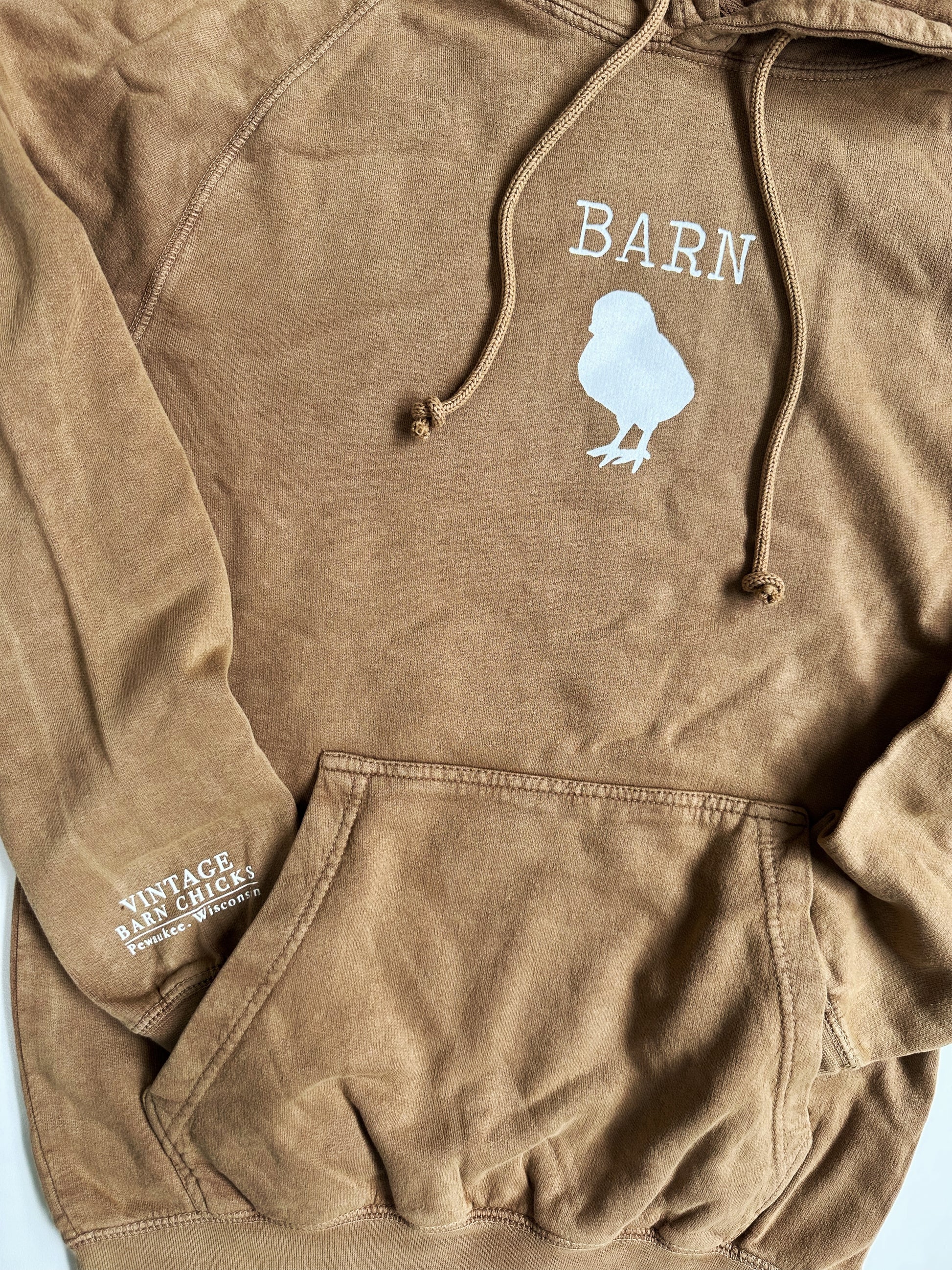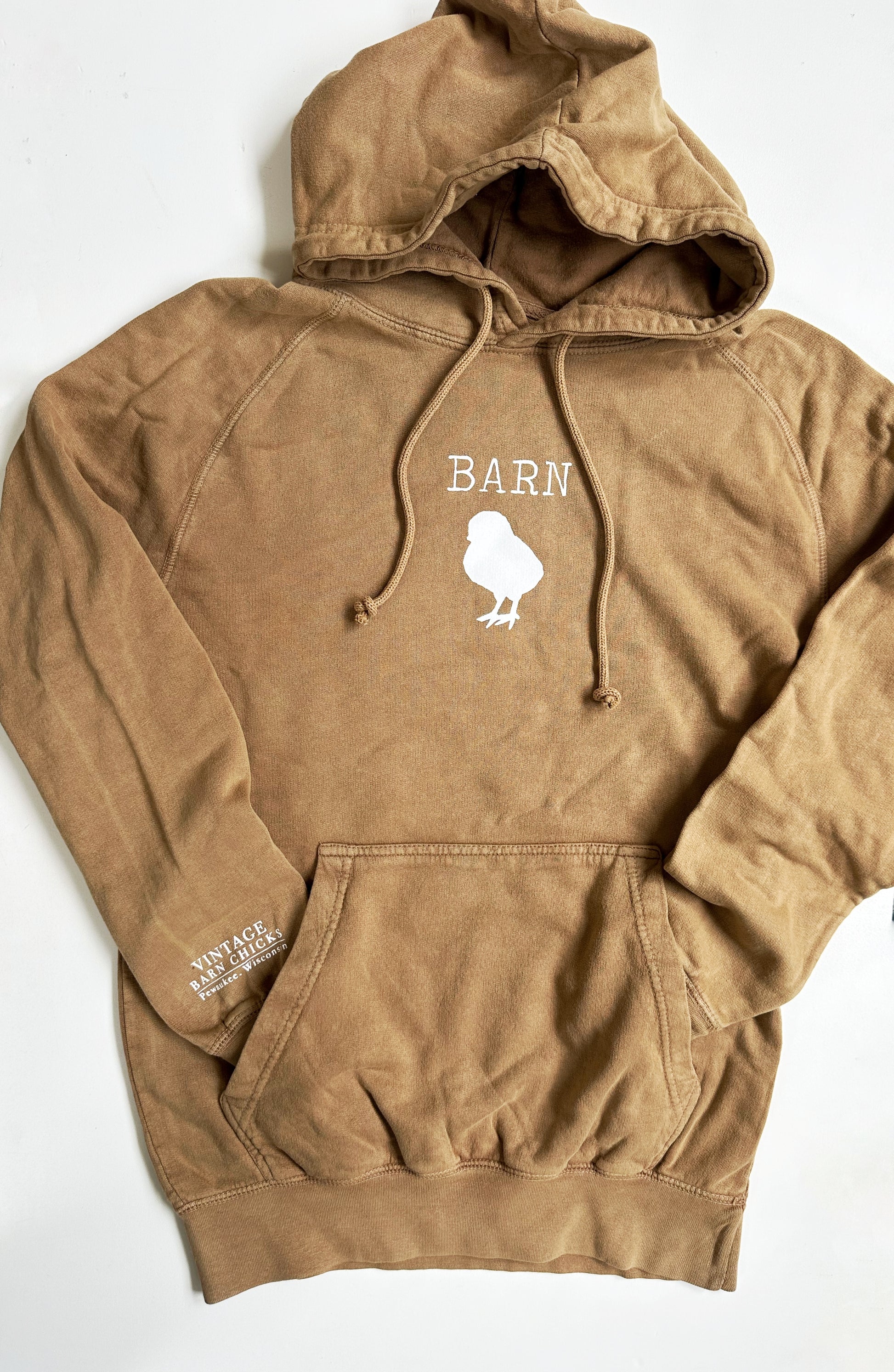New Camel Color Hoodie in a vintage wash! With our signature chick logo hoodie will seriously be a most-loved sweatshirt in your closet! The Vintage Wash Collection achieves its authentic look and feel through specializes in mineral wash processes which creates unique and natural variations and texture, distressing and shade. These are intentional and not considered defective. Please take care as the colors may transfer wash separately. Avoid contact with pale fabric and surfaces and follow care instructions. Some distressing wearing out may occur after washing and regular use.
