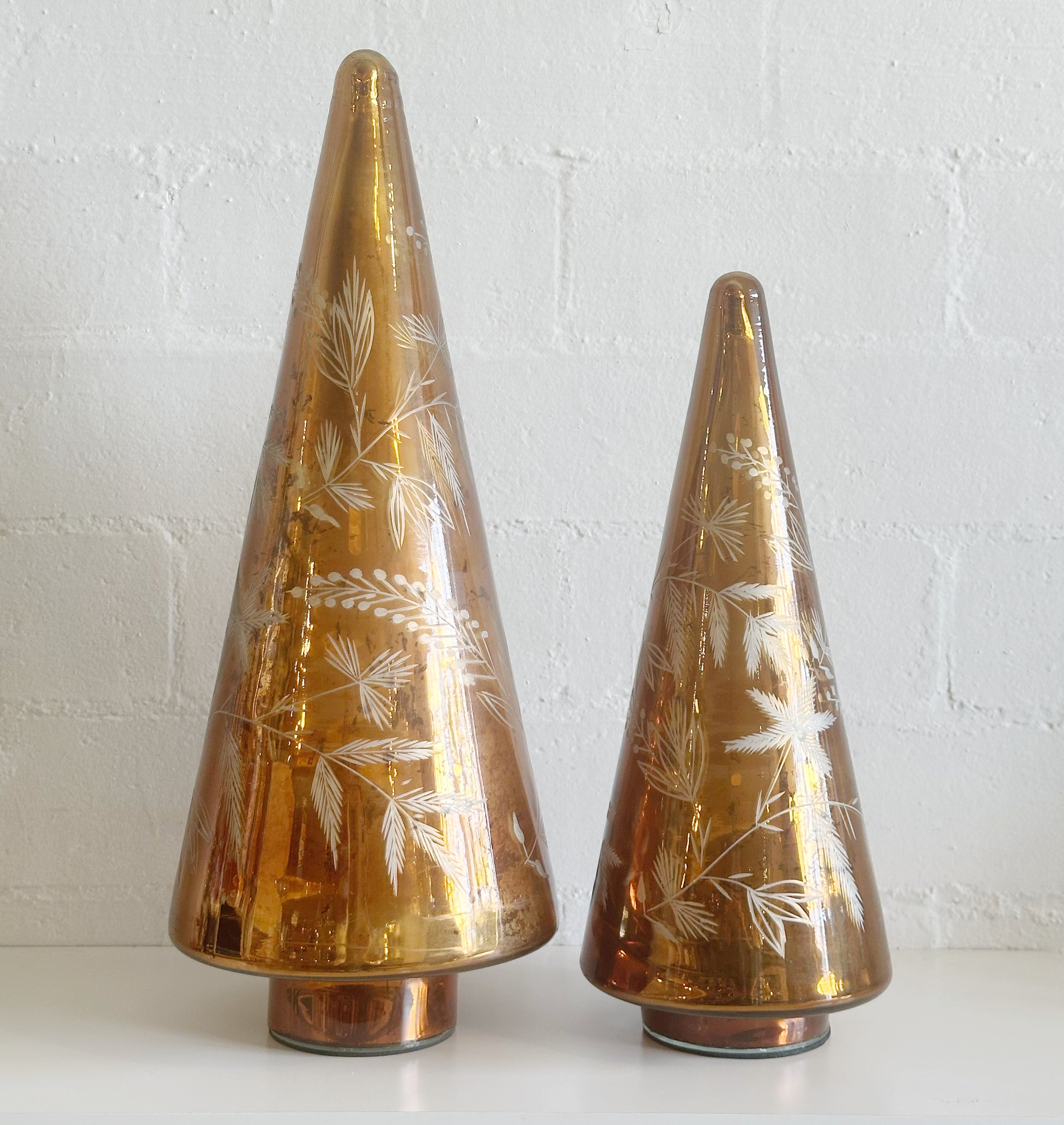 Bring an earthy & cozy glow of deep amber metallic with the Boden Tree Collection. Each tree features a winter foliage inspired etched design on a smooth glass cone-shaped silhouette, with a low foot. Available in two sizes, these charming mercury glass trees create a warm and inviting holiday scene when paired together on tabletops.