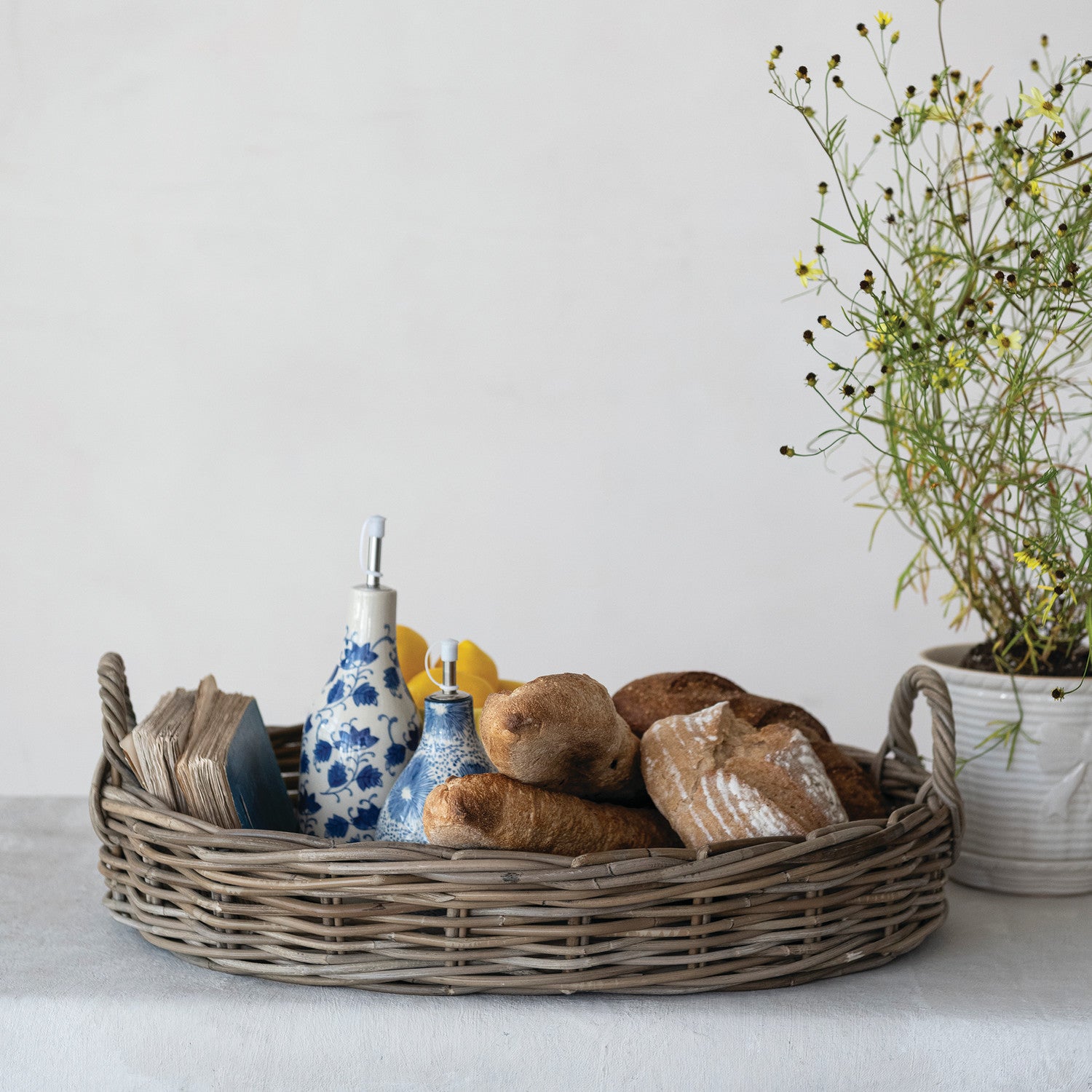 Decorative Hand-Woven Rattan Tray with Handles, Grey Washed