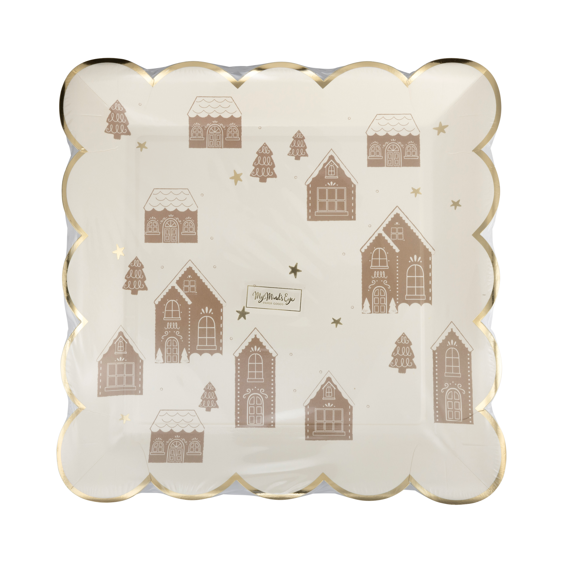 Get in the holiday spirit with our Gingerbread Scattered House 9" Plate! This charming plate features scattered gingerbread houses, bringing a touch of whimsy to your table. Perfect for serving up your favorite holiday treats or for displaying as a festive decor piece. Happy holidays! • includes 8 shaped paper plates • 10" x 10" • gold foil