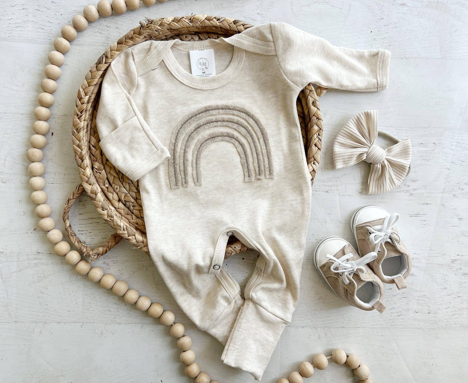 This outfit makes a perfect coming home outfit, newborn pictures, or baby shower gift. This features a soft oatmeal romper, a soft felt beige rainbow across the front. This sweet sleeper is soft and comfortable to snuggle a little one. Newborn fits best 6-9 lbs 0/3 fits best 9-13 lbs (For Coming Home Outfit Choose Newborn) 3/6 fits best 13-19 lbs