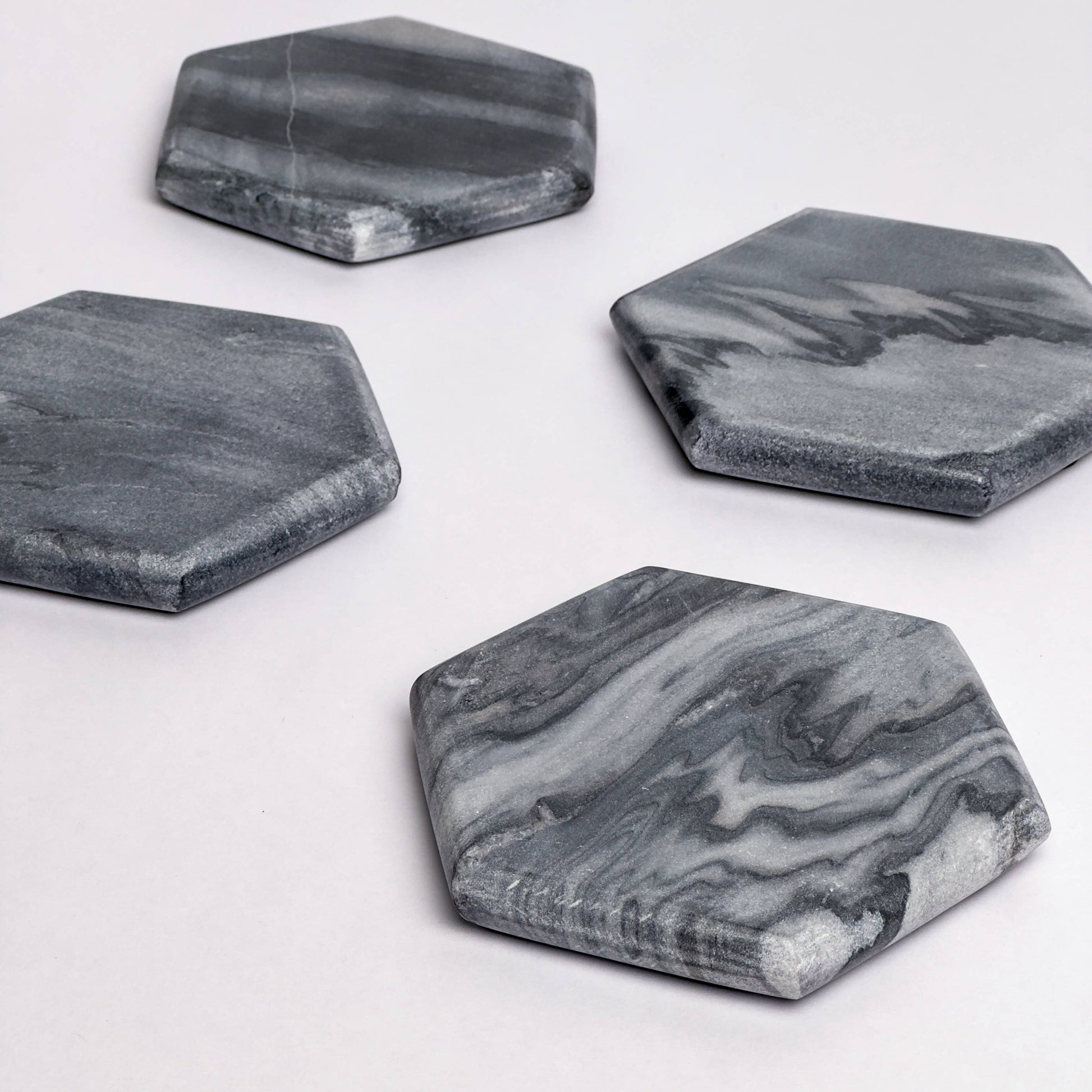 Our Gray Stone Hexa. Coaster set from India Handicrafts Inc. is a practical addition to your home. It's a piece of art crafted with skill. Each coaster is a testament to our commitment to quality, combining time-honored techniques with contemporary design. These coasters not only protect your surfaces but also tell a story of tradition, innovation, and the enduring spirit of craftsmanship. Add a touch of timeless elegance to your home, knowing that your purchase supports ethical sourcing.