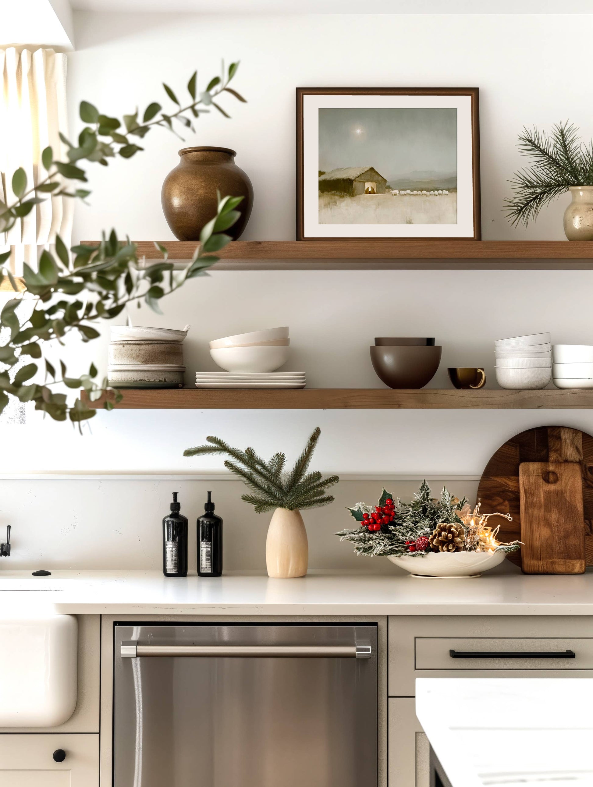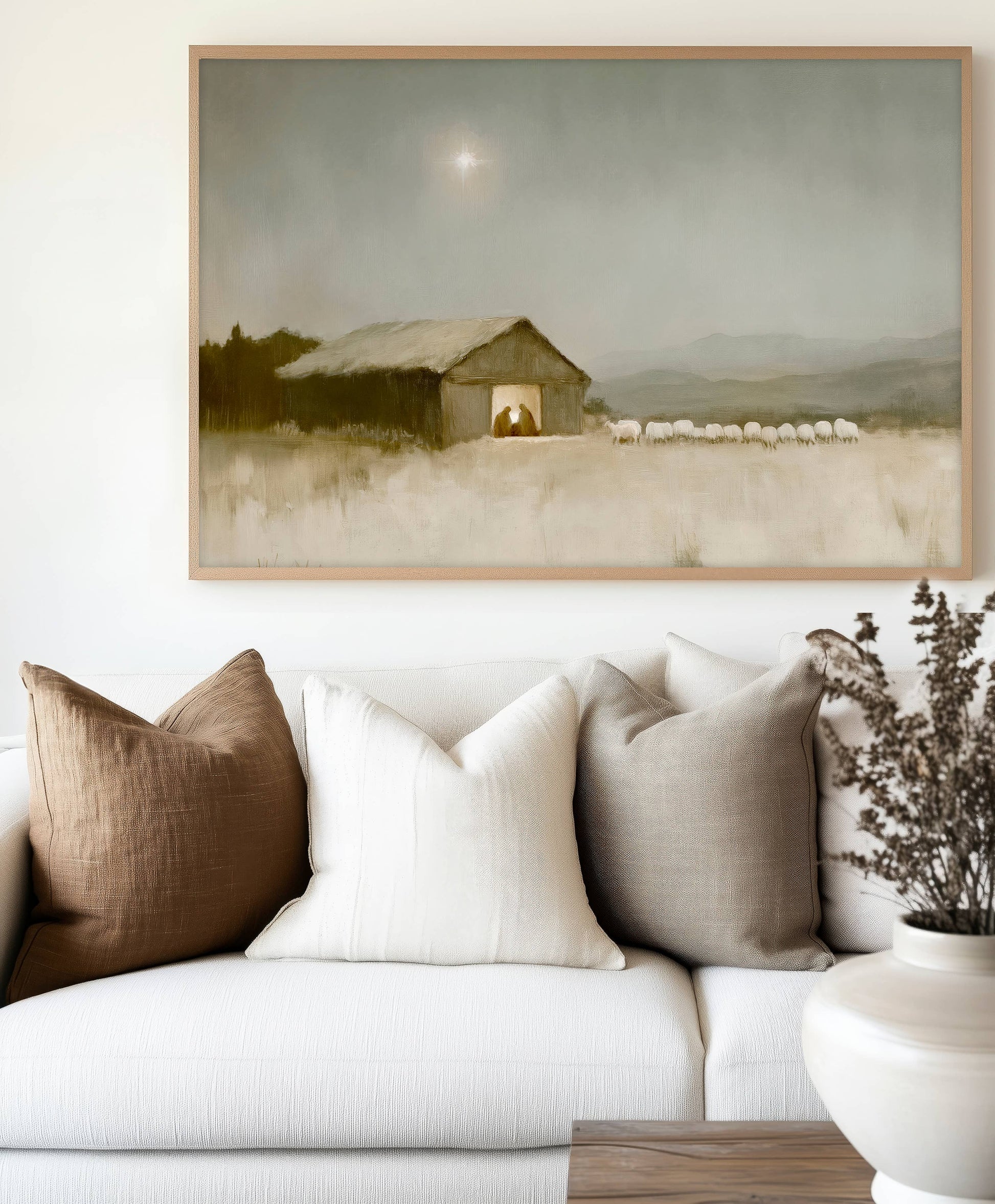 This neutral piece of Christian art is perfect for your home. It is an unframed print, wrapped in plastic. ABOUT THE ART: "Holy Night" captures the serene and sacred moment of the birth of Jesus, under the light of the guiding star. This piece invites viewers to reflect on the quiet, humble setting where the Savior entered the world. The star above, shining brightly, symbolizes hope, light, and divine guidance, leading us to the humble manger where God’s love was made manifest. Let this artwork be a gentle reminder of the peace and joy found in the true meaning of Christmas, as heaven touched earth on that holy night.