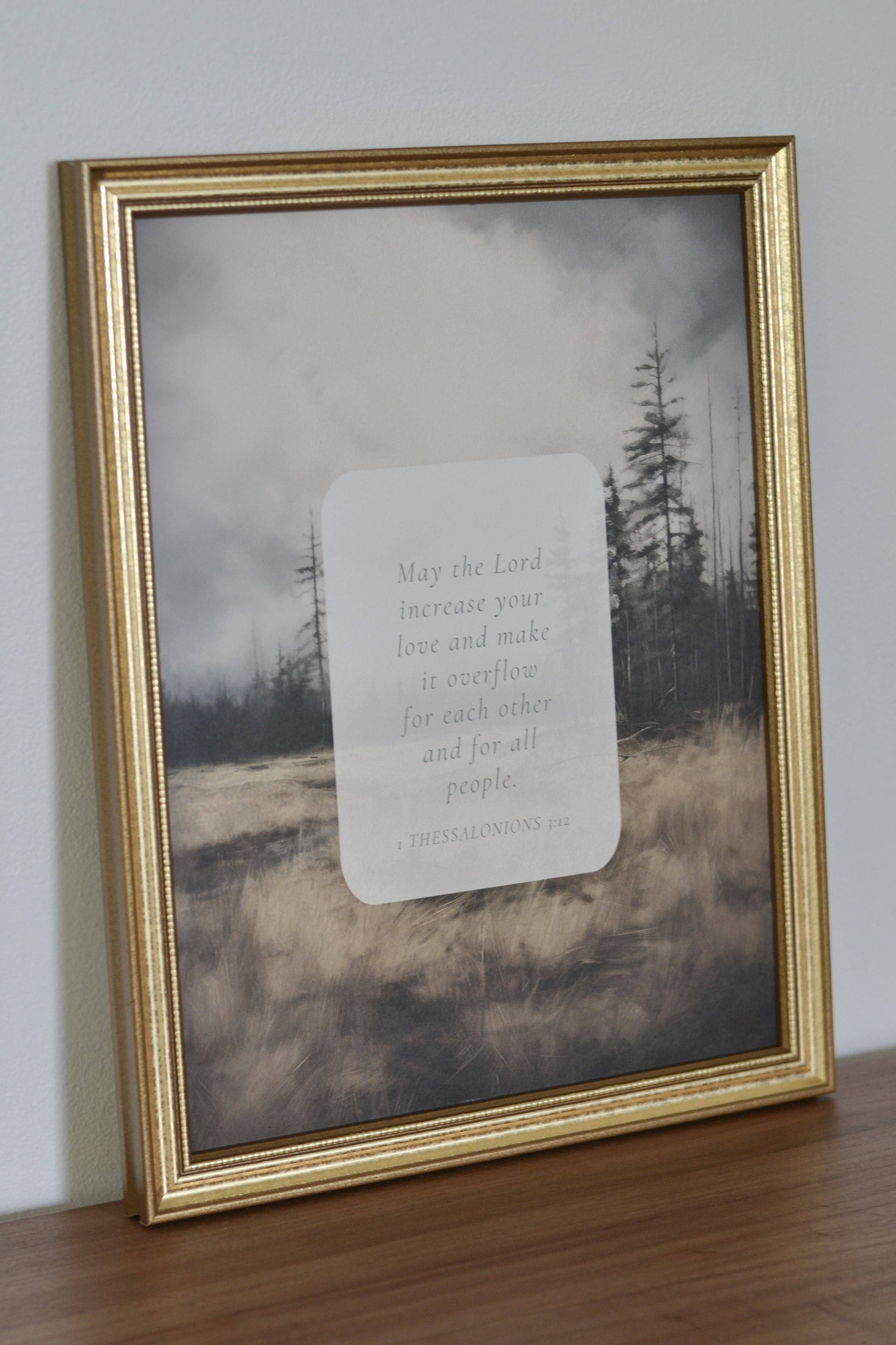 Love That Overflows features the words of 1 Thessalonians 3:12: “May the Lord increase your love and make it overflow for each other and for all people.” Set against a landscape of golden meadow and misty evergreens, this piece blends scripture and artistry to create a hope-filled presence in your home.