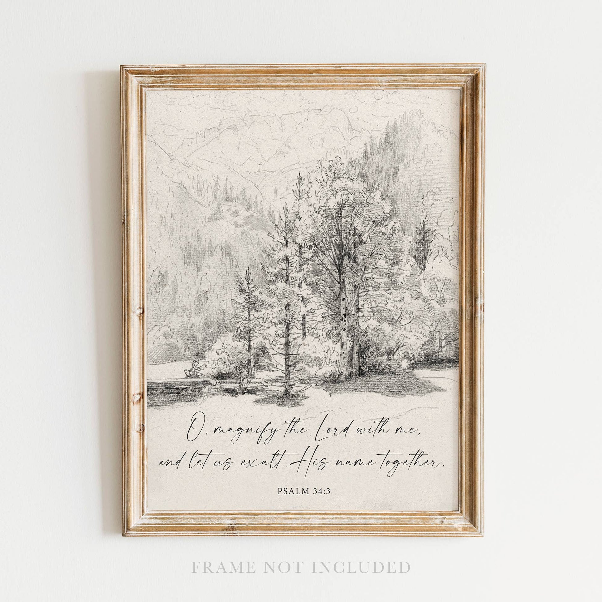 A charming, minimalistic vintage sketch of pine trees against mountains paired with Psalm 34:3. Compliments modern farmhouse, french, cottage, rustic, country, boho decor. Perfect Christian or nature lover gift. (Frame Not Included)
