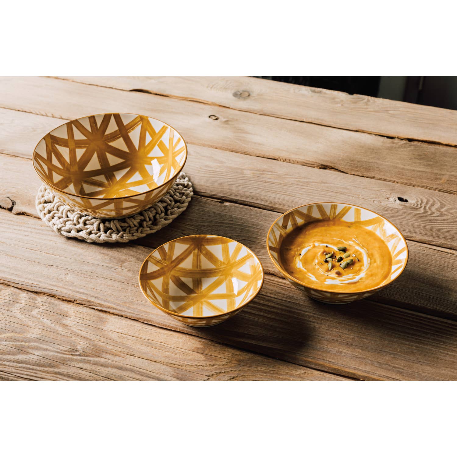 Set a hot pot or pan down on a handmade knotted trivet. The thick cotton rope provides protection and durability while offering textural intrigue.