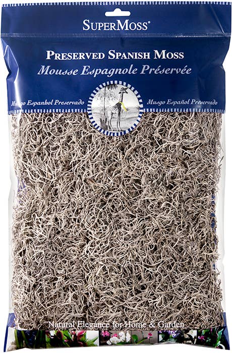 SuperMoss Preserved Spanish Moss. It grows in a swirly, spaghetti-like fashion and makes for an excellent touch to floral displays, creative projects, and your garden. Our product is responsibly procured and comes in its natural color as well as a variety of enhanced colors to match your home decor. Our product is durable and reliable to provide long-lasting beauty. It is ideal for covering soil or dressing container plants, bulbs & orchids. Spanish Moss is also a great natural fill for gift baskets. *Cleaned before packaging to remove small particles.