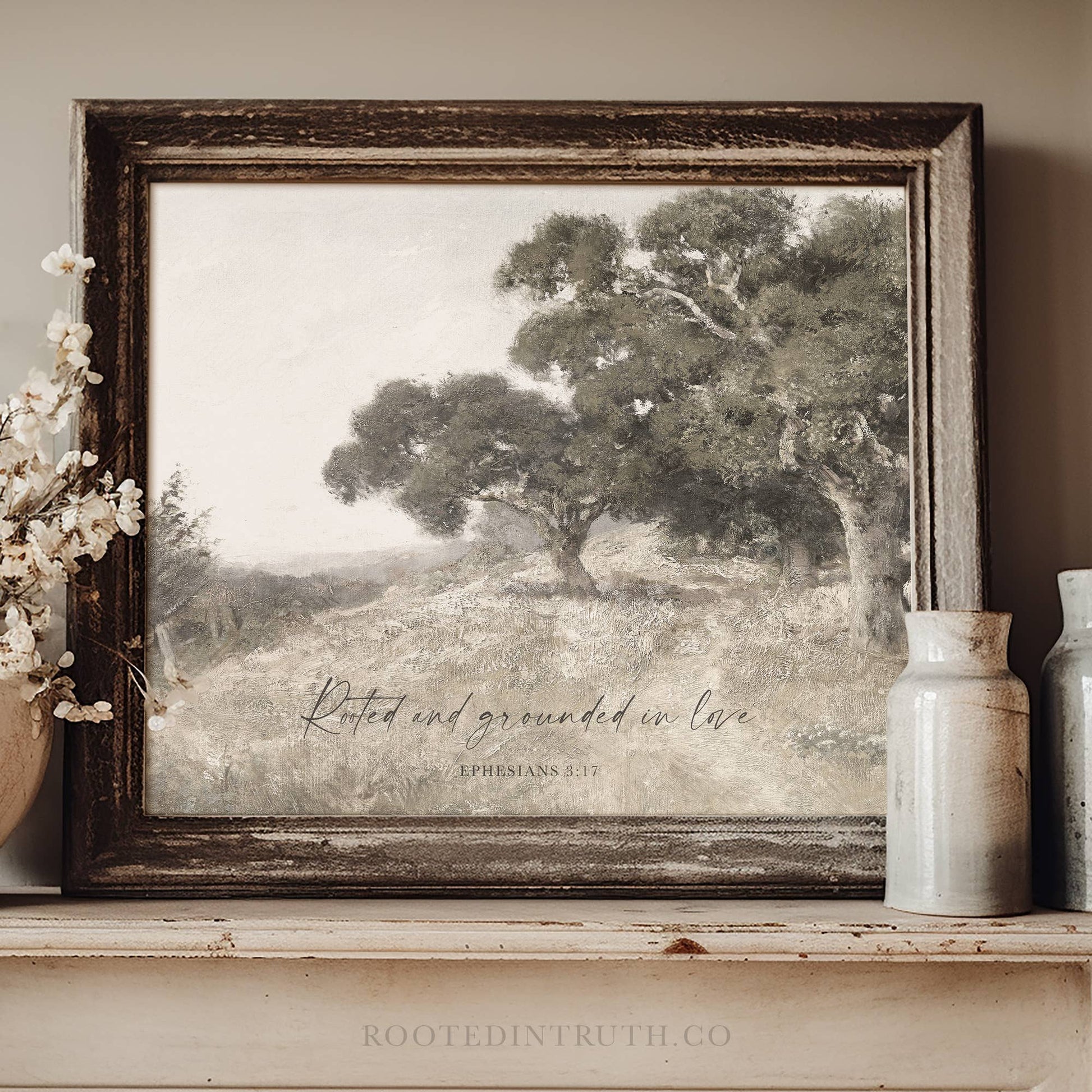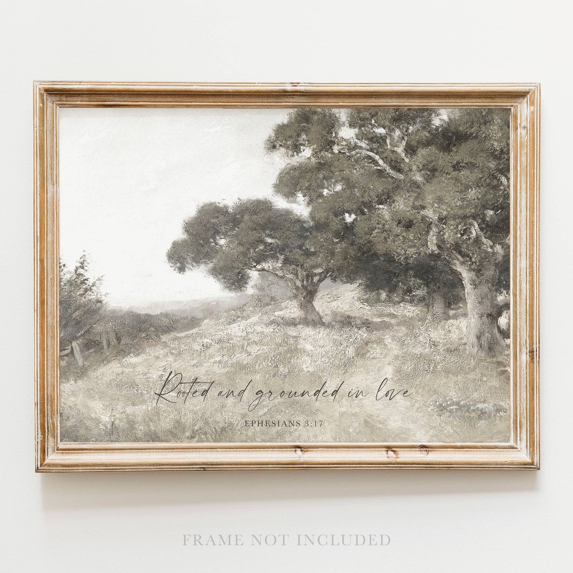 The Rooted & Grounded wall art print features a vintage painting of strong trees standing gracefully in a peaceful meadow. Compliments modern farmhouse, french, cottage, rustic, country, boho decor. Perfect Christian or nature lover gift. (Frame Not Included)
