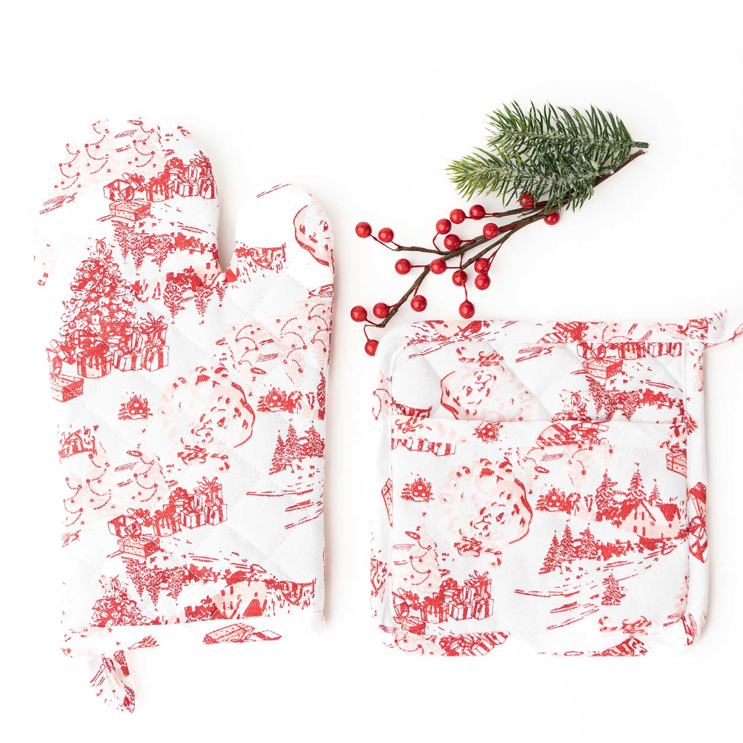 Bring the feeling of festive, yet timeless elegance into your kitchen with our Santa Toile Oven Mitt Set. Get ready to feel stylish while cooking with this set and its signature santa toile design – perfect for adding a flair of sophisticated charm to any kitchen. Crafted from 100% cotton, you know you’re getting nothing but the best in quality and comfort. Plus, each mitt and potholder also come complete with a hanging loop for easy storage when not in use! Make sure to pair this beautiful oven mitt set with our kitchen towels and aprons to create a wonderful gift for someone special or just use them as the perfect way to celebrate yourself!