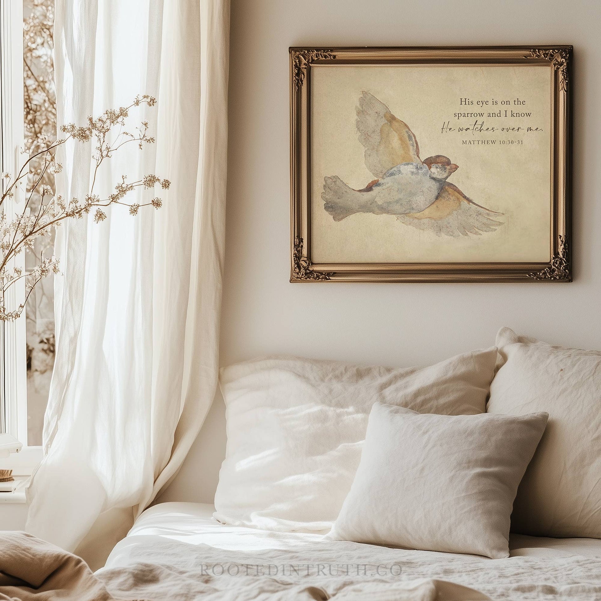 A graceful vintage painting of a gentle sparrow in soft, muted tones. Paired with the scripture reminder of God's loving, watchful care over His children. Compliments modern farmhouse, french, cottage, rustic, country, boho decor. Perfect Christian or nature lover gift. (Frame Not Included)