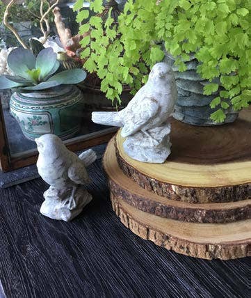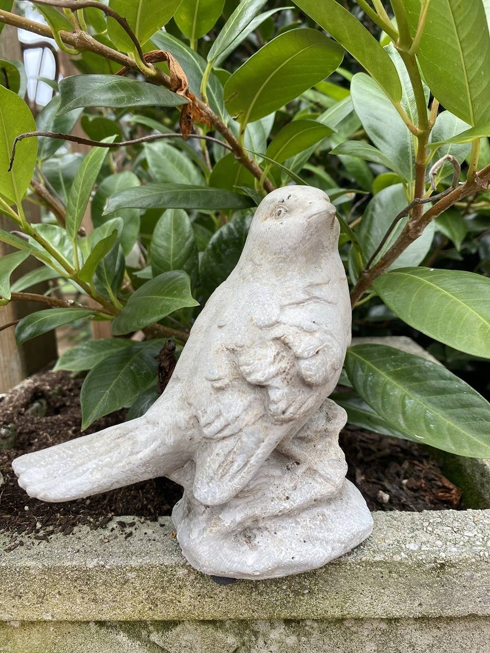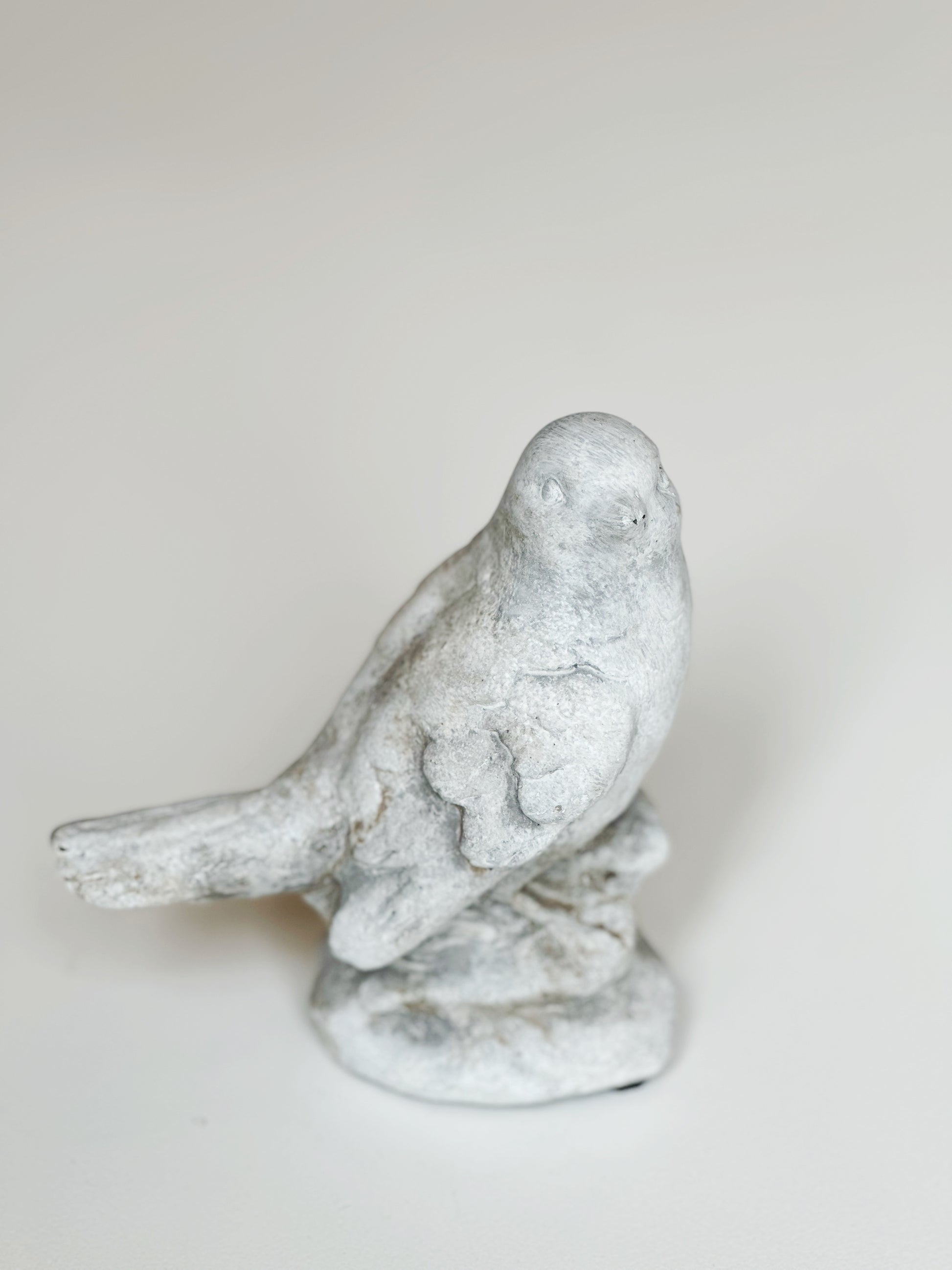 Taller Cast Cement Bird Statue on a small round base. Use for both indoor decor or outside in the garden. Note - natural changes will occur in the concrete including fungus growth if used outside.