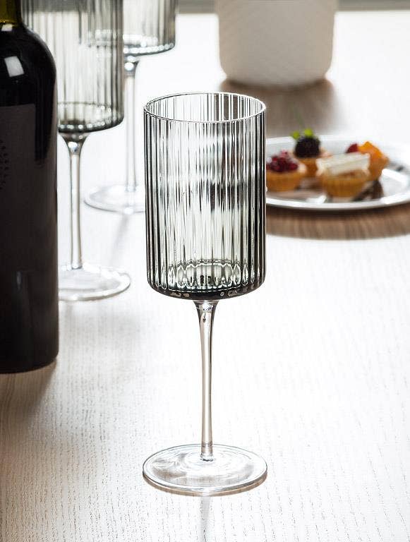 This Ribbed Wine Glass features a stylish smoke hue and an elegant ribbed texture that catches the light beautifully. Perfect for serving your favorite beverages, its unique design adds a touch of modern elegance to any table setting. Ideal for both everyday use and special occasions.
