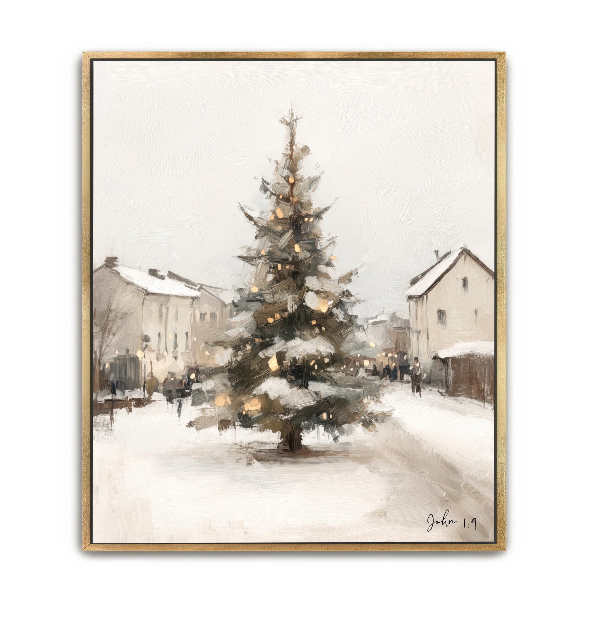 A quiet winter evening in a small village, where neighbors gather beneath the glow of a single tree. Its light warms the snow-covered street, a simple reminder of the Light that came into the world — Jesus, the true hope of Christmas.
