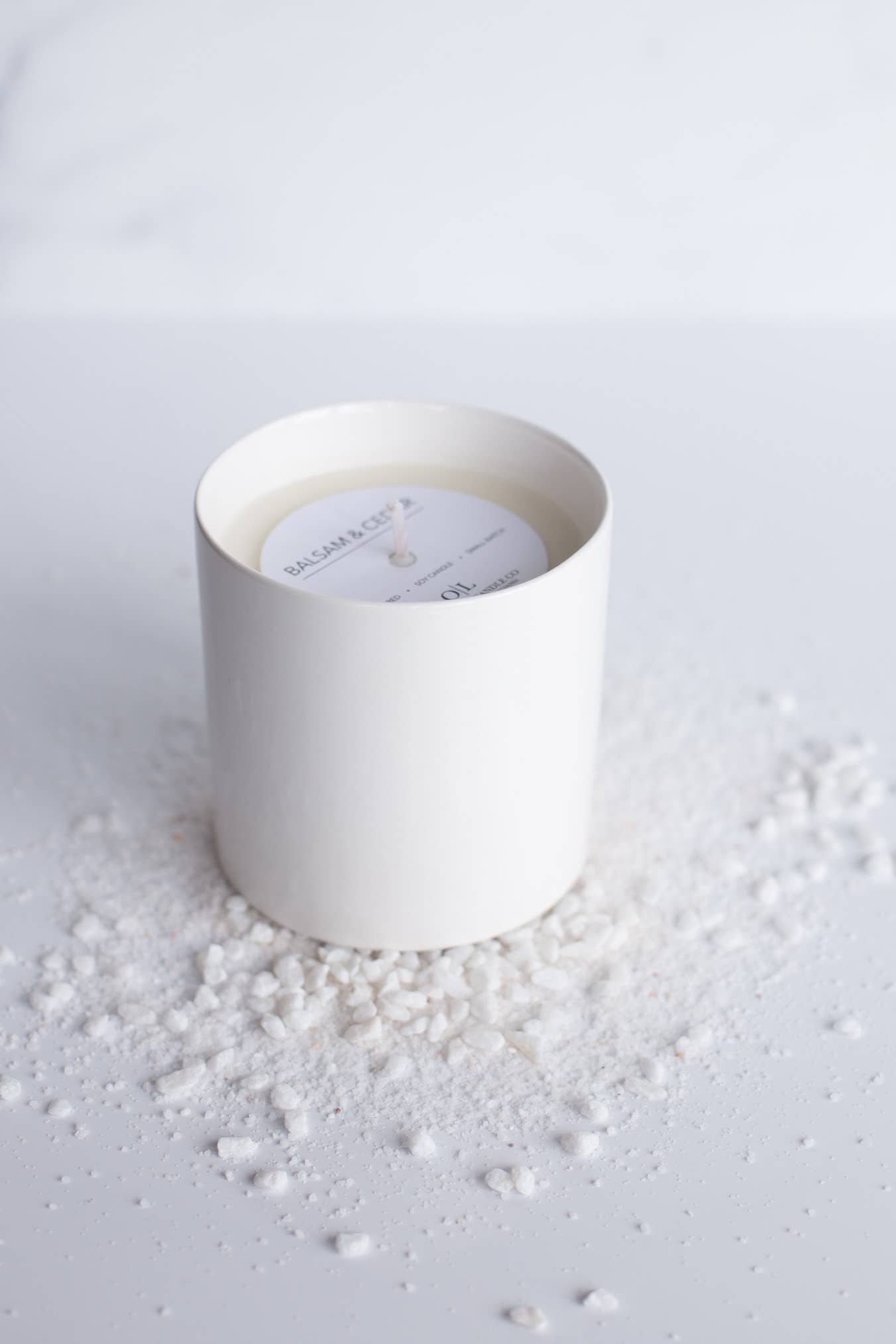 Our ceramic candle is filled with approximately 10oz of 100% soy wax. Due to the handmade nature of this vessel there will be slight imperfections and variations noted in the pottery. We use phthalate free fragrances and a cotton wick for the cleanest burn. Approximate burn time is 50 hours.
