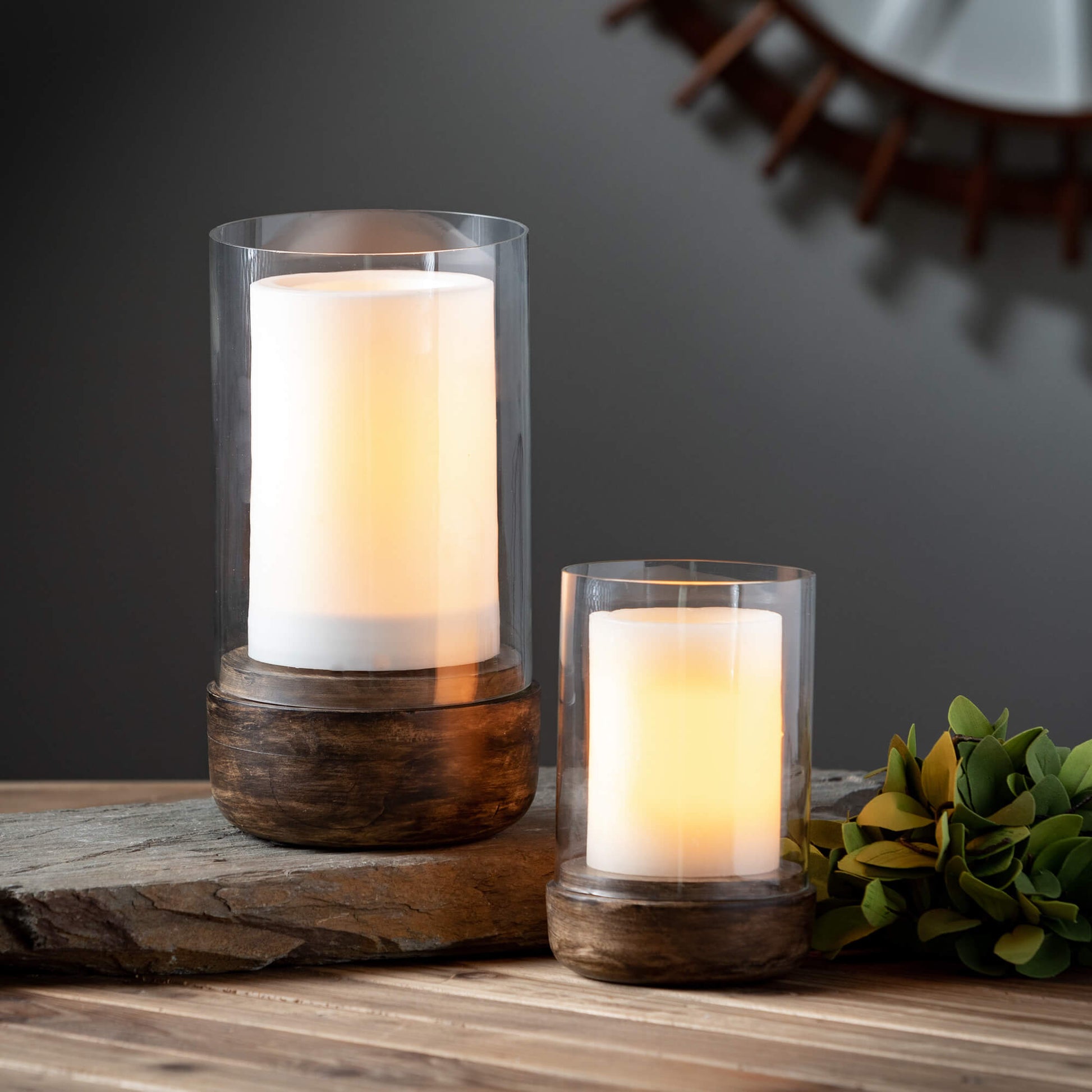 Add some subtle elegance to your decorating with these wood hurricane candle holders. 2 piece modern glass hurricane with a warm, wood base.