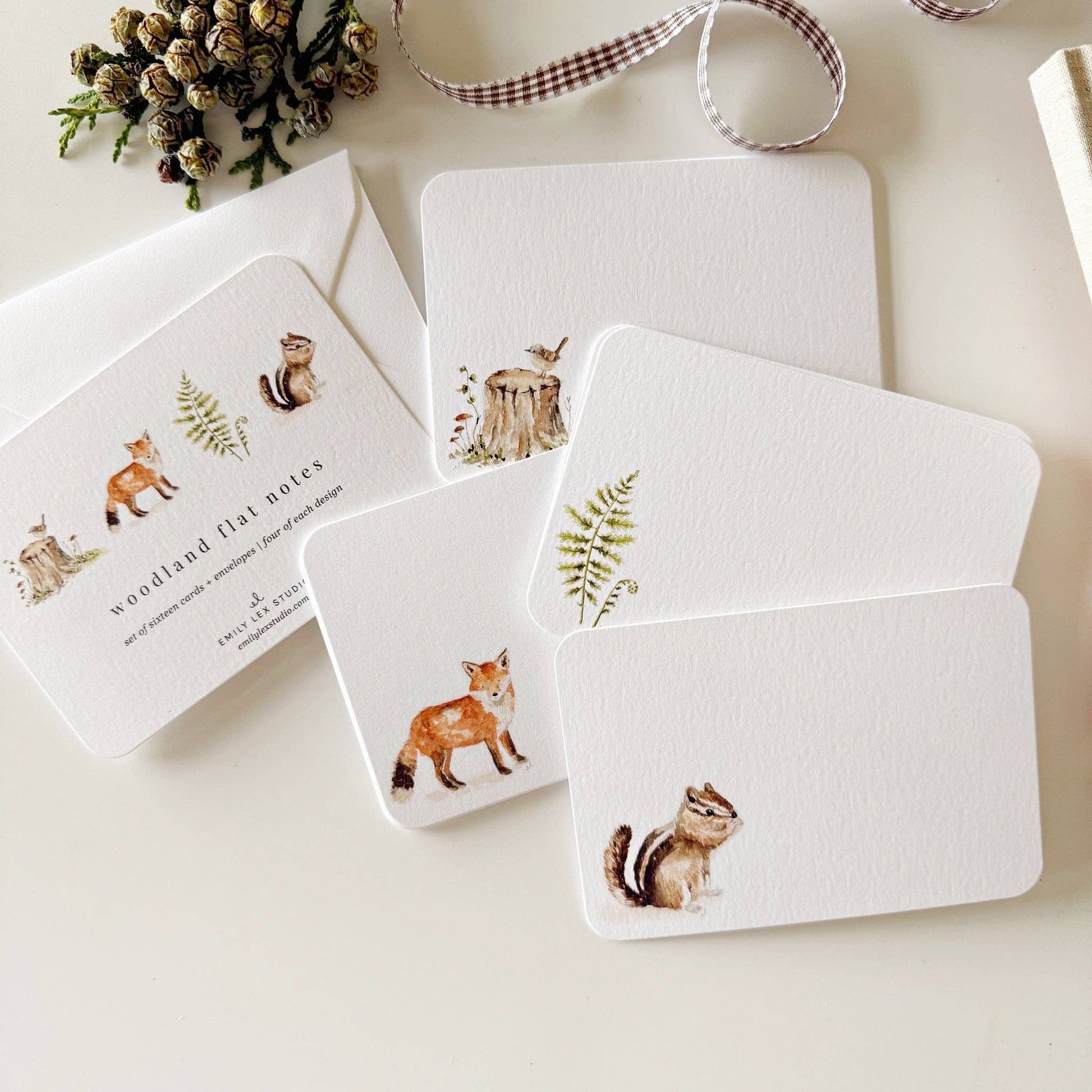 Delight in the simple beauty of handwritten notes with this charming set of flat notecards. Perfect for quick hellos, thoughtful greetings, or heartfelt thank-you's, each set includes 16 cards featuring four whimsical illustrations: a tree stump, a playful fox, a delicate fern, and a curious chipmunk. Finished with softly rounded corners, these cards bring a touch of sweetness to every message you send.